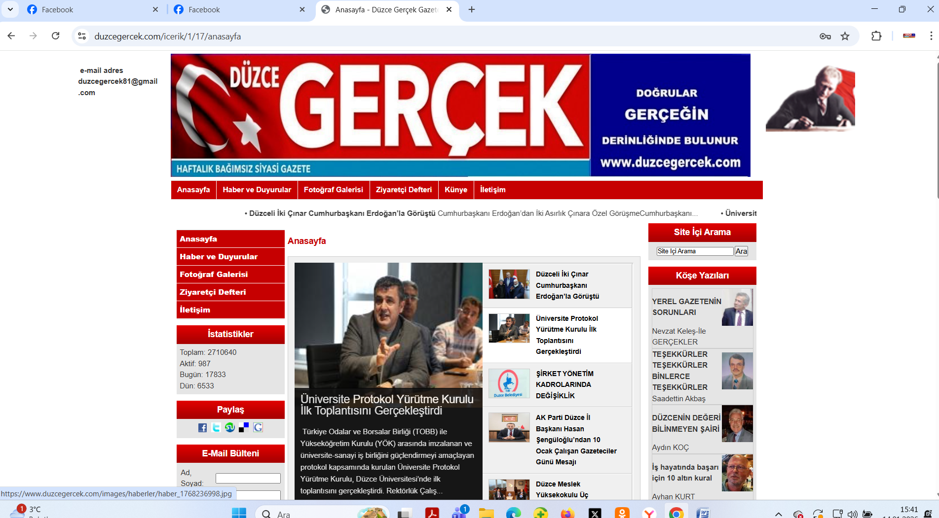 Keleş ’ Yalnızca doğru habere dayanan gazetecilik anlayışımız ve halkın yanında saf tutan makaleleriyle halkımızın sorunlarına çözüm arayan çok değerli yazarlarımızla verdiğimiz mücadele sonuç verdi. Bu gün 17.000 Kişi sınırını aşarak saat 15.30 itibariyle 17.833 kişi okuyucu sayısına ulaştı. Okurlarımız, bizlerin yapmaya çalıştığı gazeteciliğe gereken değeri vererek Düzce Gerçek gazetesini Düzce'nin en çok okunan internet gazetesine yükseltti Teşekkürler binlerce kez Teşekkürler’’dedi